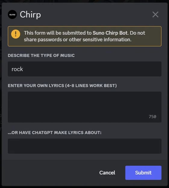 - Appuyez sur Enter : Après avoir tapé /chirp, appuyez sur Enter. Une fenêtre contextuelle s'affiche pour vous permettre de saisir vos paroles ou votre texte.